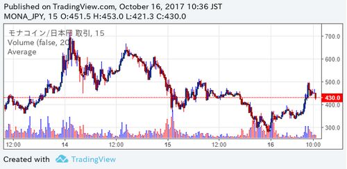 土曜の20時くらいまではモナコインが絶好調でした。 600円台だったモナコインも日曜の23時頃には280円をつけました。 動き始めたのは今朝の8時頃から上昇という 非常にわかりやすいチャートでした。 これは仮想通貨の取引ではよくある 「月曜の朝は高騰する…